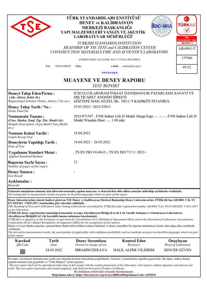 Ses Yalıtımlı Kapı Test Raporları